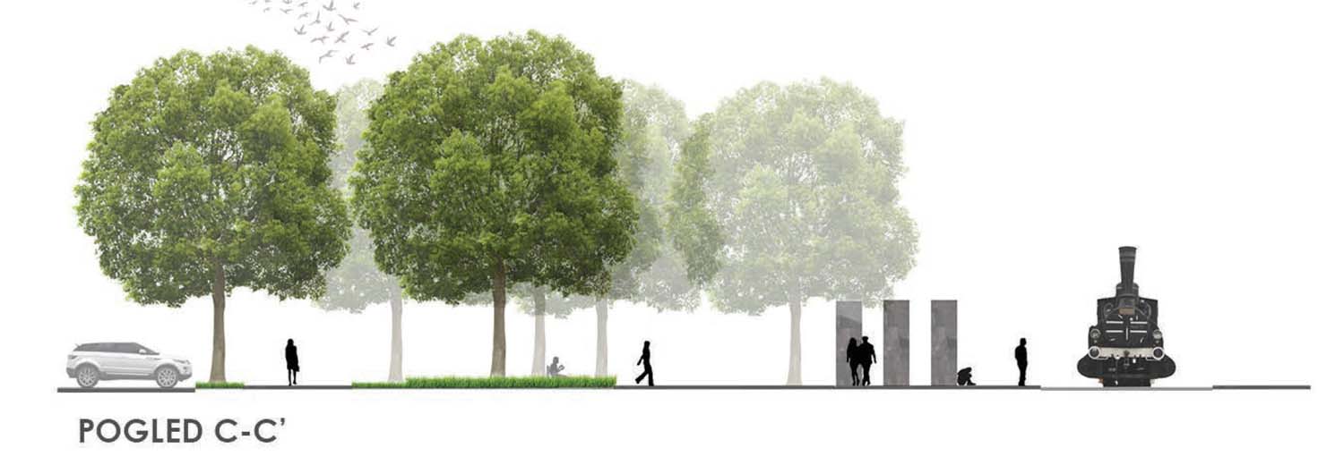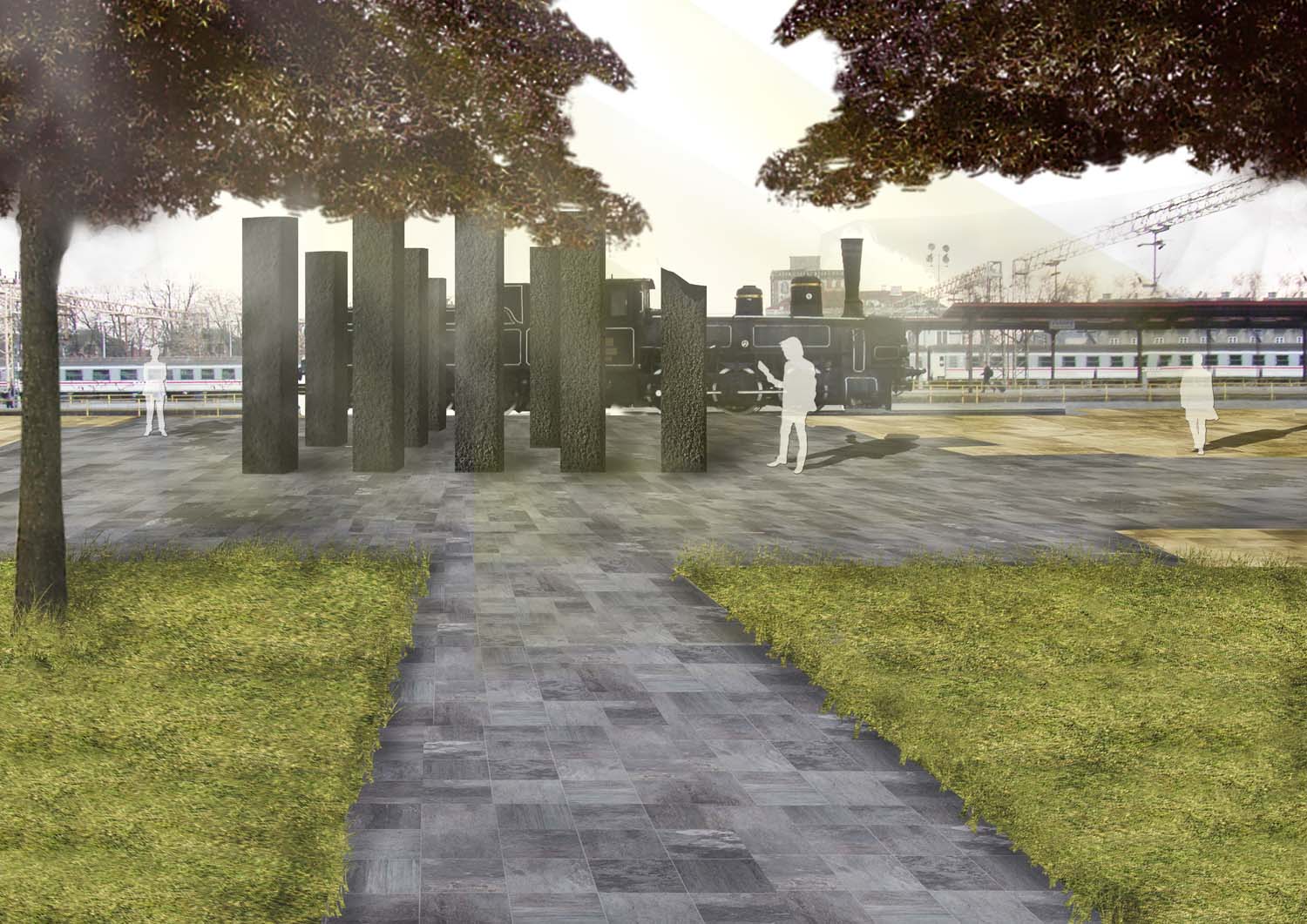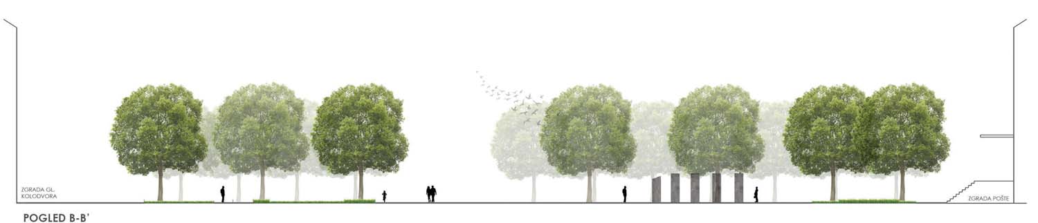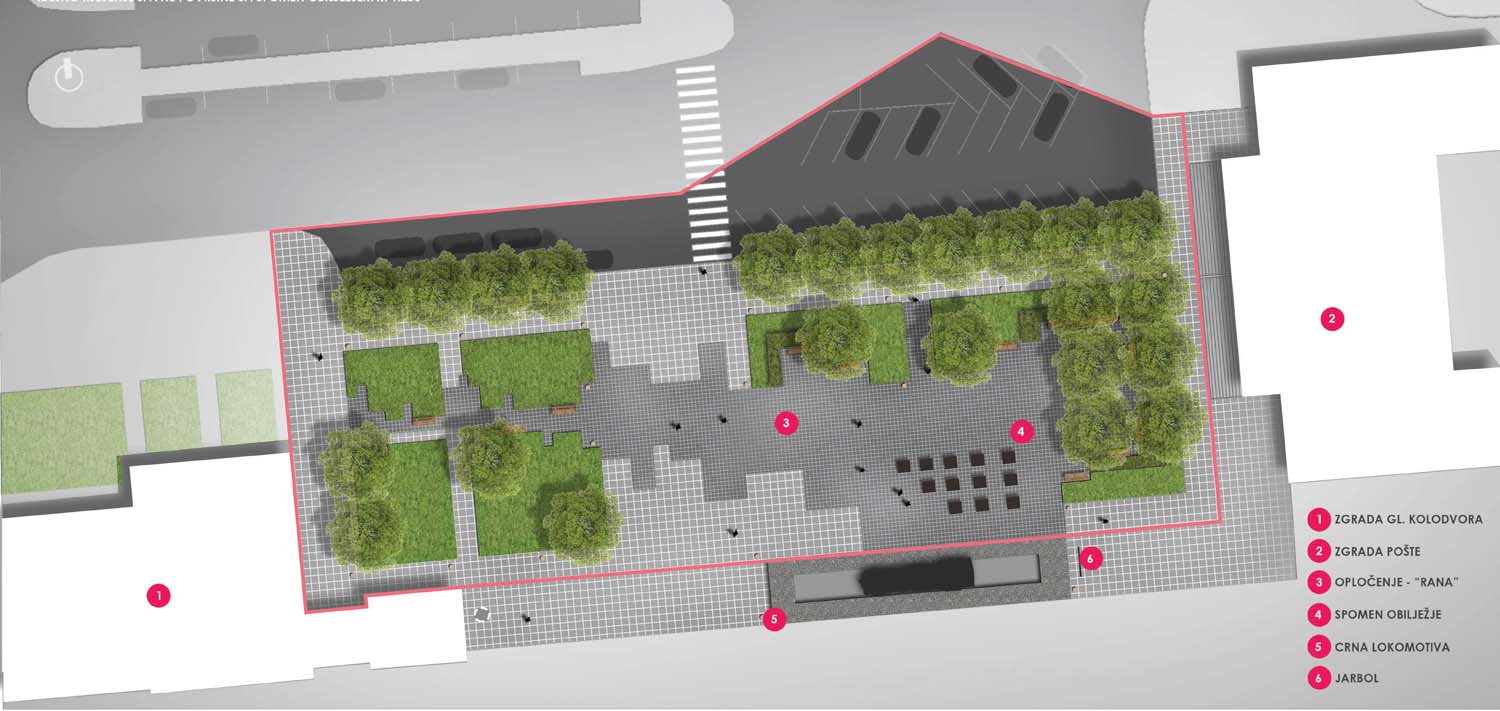 Oblikovanje cjelokupnog prostora prvenstveno je bilo određeno postojećim osima i smjerom kretanja korisnika. Pritom se nastojalo poštovati, ali i istaknuti osi koje se otvaraju između zgrade Glavnog kolodvora i zgrade pošte, te pogleda na eksponat crne lokomotive. Oblikovanjem se nastojalo osigurati nesmetano kretanje na sjevernom i zapadnom dijelu obuhvata, gdje je trenutno učestalije kretanje, dok je na istoku stvoren intimniji prostor, u koji je u konačnici smješten akcent promatranog rješenja; spomen obilježje od dvanaest granitnih blokova, odnosno stupova. Pritom okosnicu rješenja predstavlja sivo opločenje „prostorne rane“, kao značajan kontrast okolnom svijetlijem opločenju, a pruža se i usmjerava korisnike prema spomen obilježju.