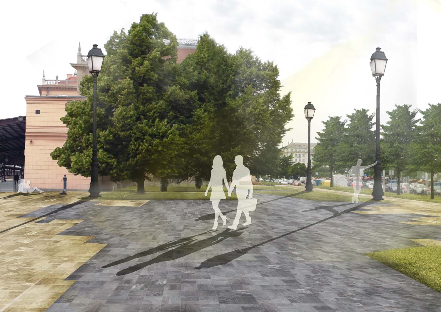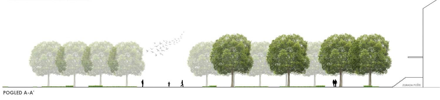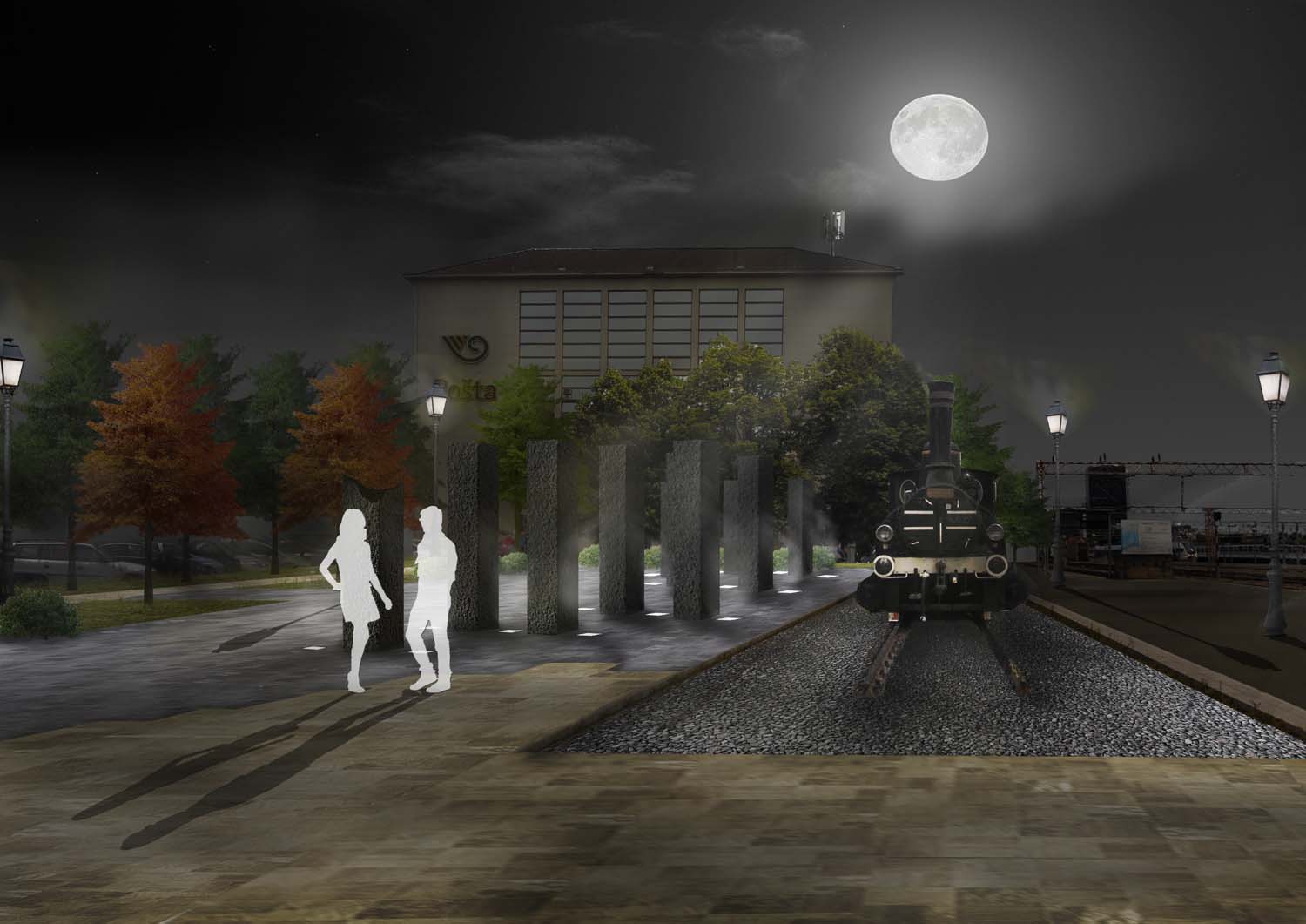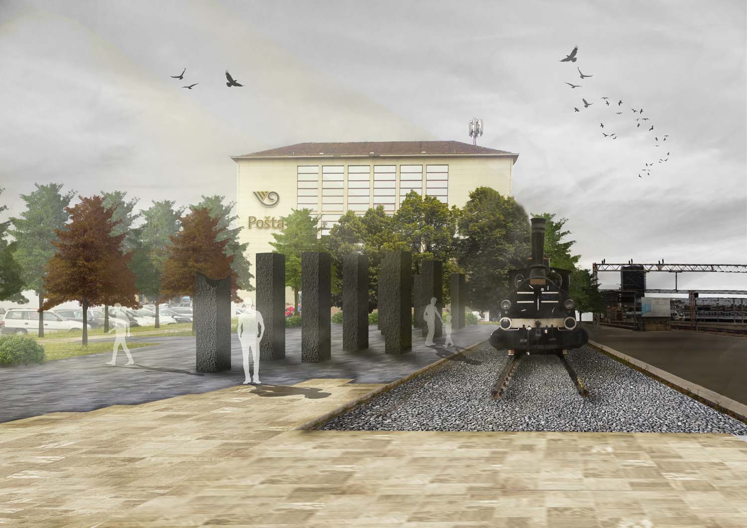 Oblikovanje cjelokupnog prostora prvenstveno je bilo određeno postojećim osima i smjerom kretanja korisnika. Pritom se nastojalo poštovati, ali i istaknuti osi koje se otvaraju između zgrade Glavnog kolodvora i zgrade pošte, te pogleda na eksponat crne lokomotive. Oblikovanjem se nastojalo osigurati nesmetano kretanje na sjevernom i zapadnom dijelu obuhvata, gdje je trenutno učestalije kretanje, dok je na istoku stvoren intimniji prostor, u koji je u konačnici smješten akcent promatranog rješenja; spomen obilježje od dvanaest granitnih blokova, odnosno stupova. Pritom okosnicu rješenja predstavlja sivo opločenje „prostorne rane“, kao značajan kontrast okolnom svijetlijem opločenju, a pruža se i usmjerava korisnike prema spomen obilježju.