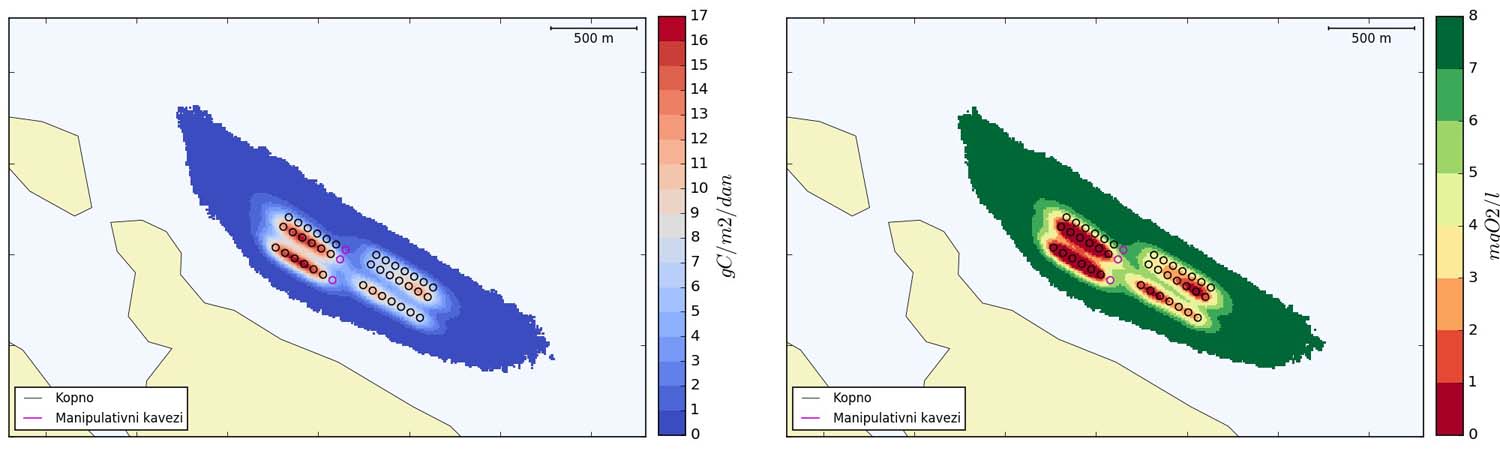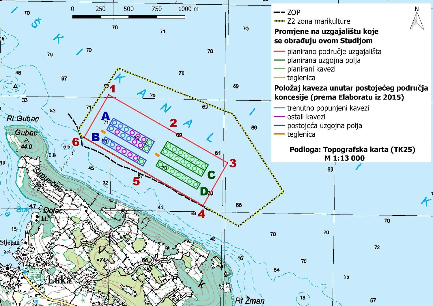 Zahvat se odnosi na povećanje kapaciteta uzgajališta bijele ribe uz Dugi otok, između rtova Žman i Gubac. Za potrebe studije, izvršen je biocenološki pregled, pri čemu je cilj bio upoznavanje morskih staništa, dok je posebna pažnja posvećena prisustvu zaštićenih staništa i vrsta. Analizirane su četiri varijante korištenja planiranih uzgojnih volumena te su za iste izračunate emisije iz kaveza. Pomoću numeričkog modela i izračunatih emisija, procijenjen je dotok tvari na dno i koncentracija kisika pri dnu. Na osnovi podataka o okolišu i rezultata modela procijenjen je utjecaj emisija na okoliš za razmatrane varijante.